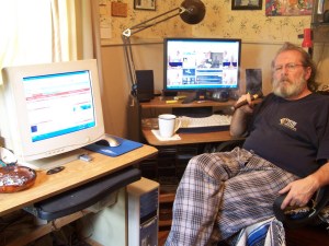 Now comes the heavy lifting. Power all my shit down, start unplugging everything, and move all my shit. Move the iMac from the stand where I have it to the metal keyboard drawer, move the 17 inch CRT over to the printer stand that I use as a second computer desk (with the under desk keyboard drawer.) Move the stand over a bit so I can fit the Cyberpower’s tower next to it. Hook up the Acer keyboard, GE optical mouse, Altec Lansing ACS90 speakers, and the LAN cable to it. Power up, edit the BIOS settings and test, and I am back online.