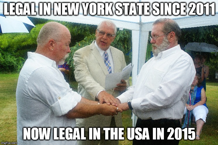 I could be a be a total curmudgeon today about the Supreme Court ruling on same-sex marriage, but I am going to restrain myself.  All I have to say is, we as a species, continue to evolve.   Evolution in our views on what defines marriage is inevitable.  Ever since I met my husband in the May of 2000 (online of all places, on Gay.com) I have found that it is an uphill battle to become recognized as a couple.  When same sex marriage became legal in New York state in 2011, Dan and I knew that it was going to be inevitable that we would tie the knot.  I did so willingly, because he and II , even though we are exact opposites in a lot of ways, we are in sync about our relationship.  Yes, he and I did wait for a little over a year after it was signed into law.  But we were glad that we did so.